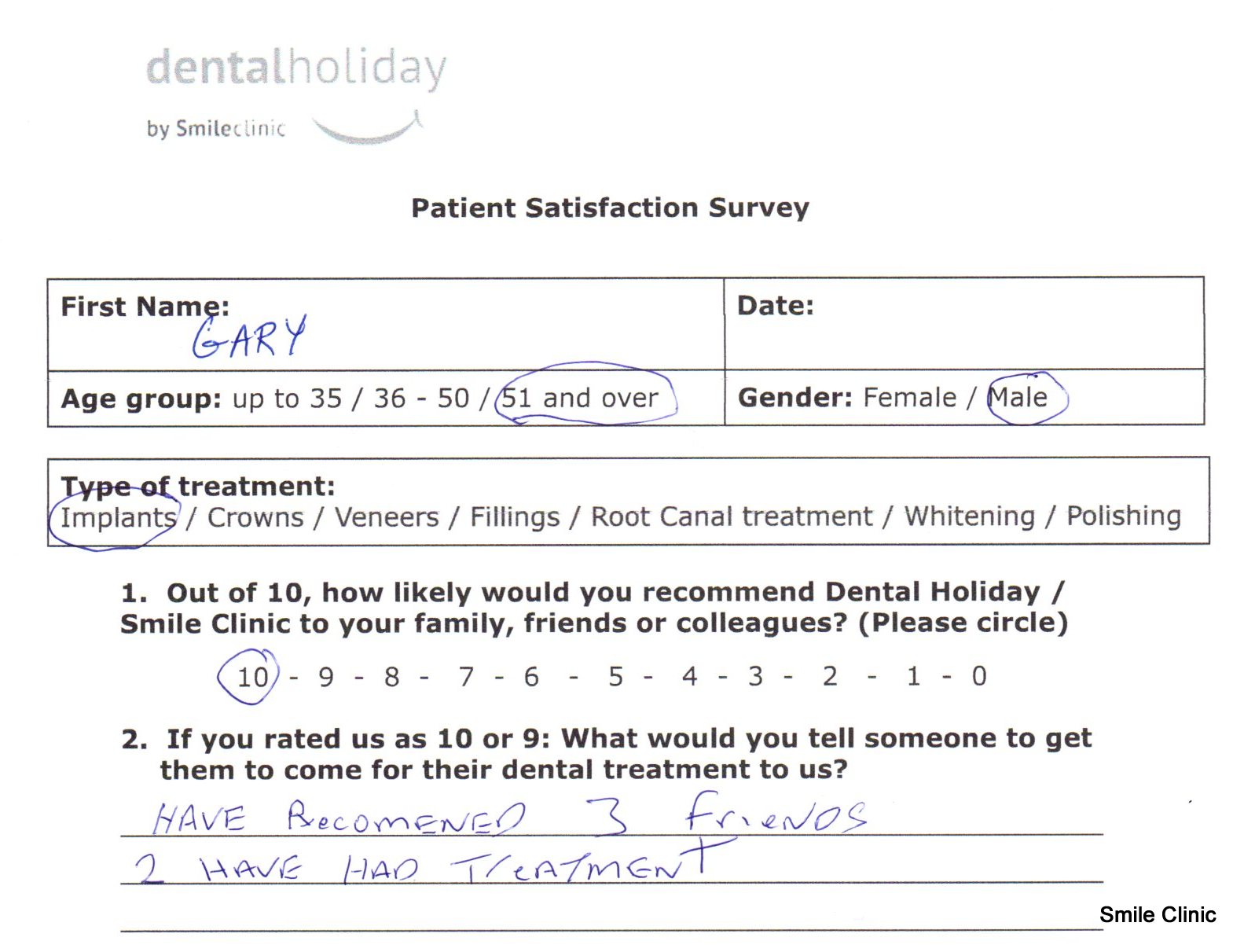 Gary gave us 10/10 on our patient feedback form and wrote that he “had recommended 3 friends and 2 have treatment already.”