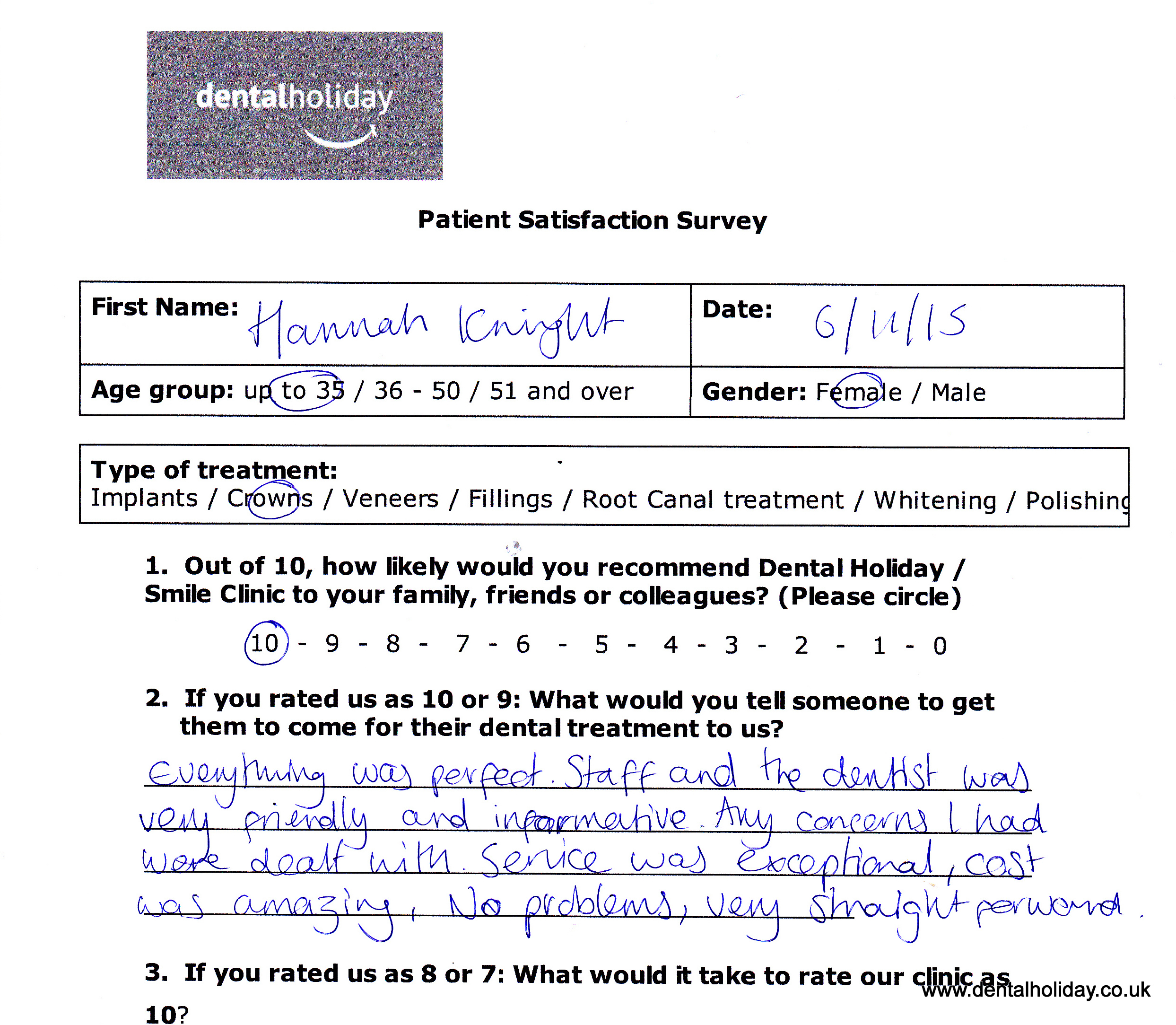 Hannah gave Smile Clinic – Dental Holiday a 10 and here is her review in her own words.