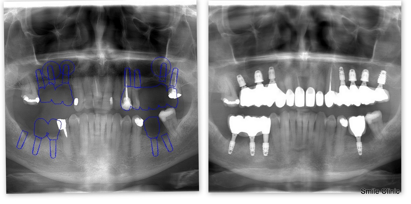 We placed 7 implants and crowns to the top jaw and 4 implants and crowns to the bottom jaw, saving some of his existing teeth.