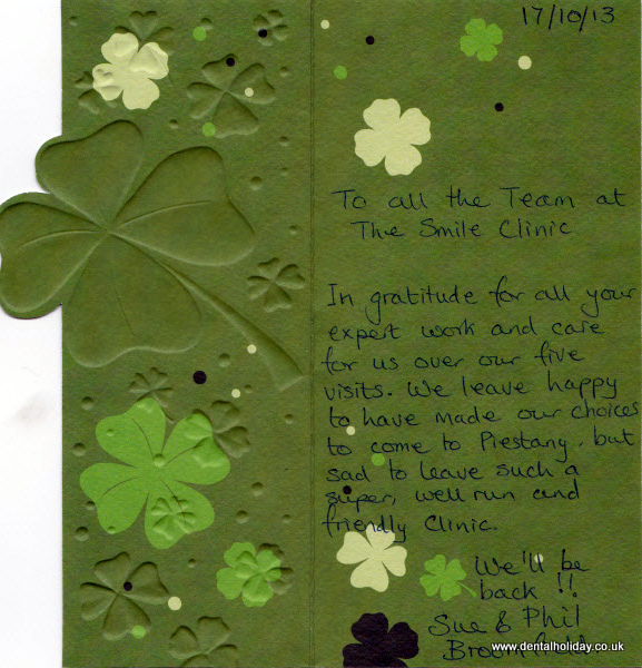 To all the Team at The Smile Clinic. In gratitude for all your expert work and care for us over our five visits. We leave happy to have made our choice to come to Piestany but sad to leave such a super, well run and friendly clinic. We will be back!“