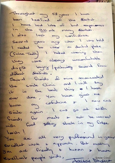 Through my 58 years of age I have been terrified of the dentist. I have had lots of bad experiences in the UK at many dentists. I also lost my confidence several years ago when I was told I need to wear a dental plate (false teeth). I hated wearing them, they were always uncomfortable despite several being from different dentists.