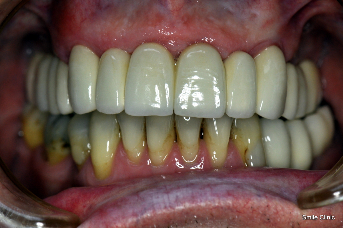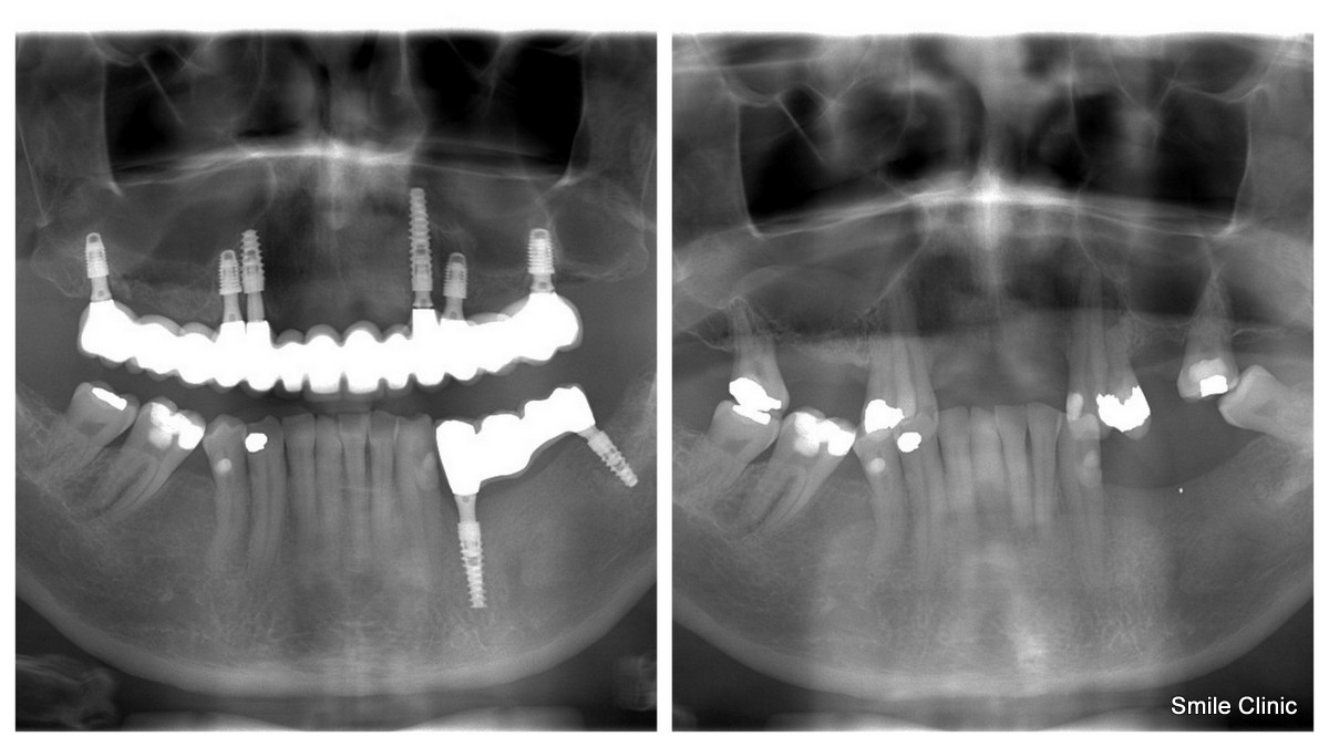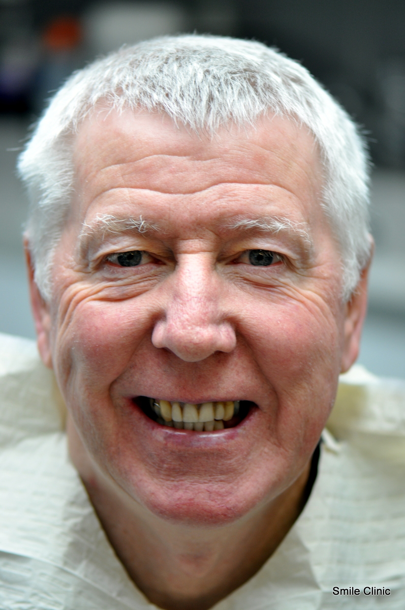 He had been wearing false upper teeth for some time, and decided to finally get rid of it by opting for the “all on 6” dental implant procedure giving him 12 new, fixed teeth for his upper jaw on 6 dental implants, as well as a crown tooth bridge of 4 teeth for the bottom jaw towards the back for added eating strength.