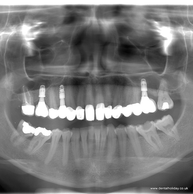 This process took 3 visits, each with an overnight stay, and as you can see from the x-ray, it was 3 dental implants supporting 13 crowns. Each time she stayed in a local hotel that overlooks the river and is close to the famous Piešťany spa island.