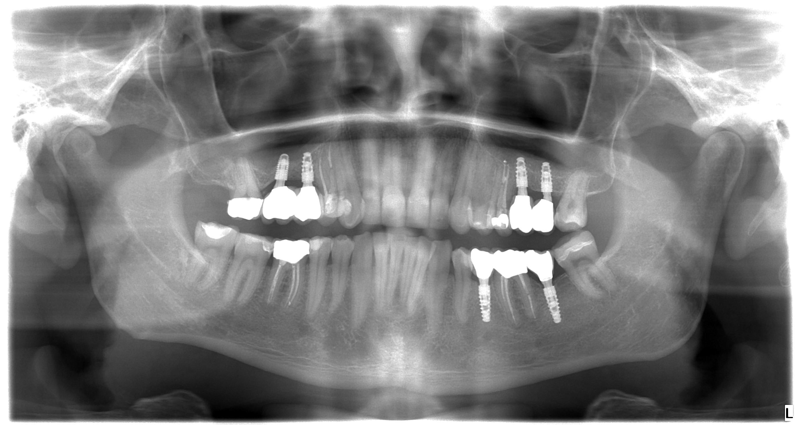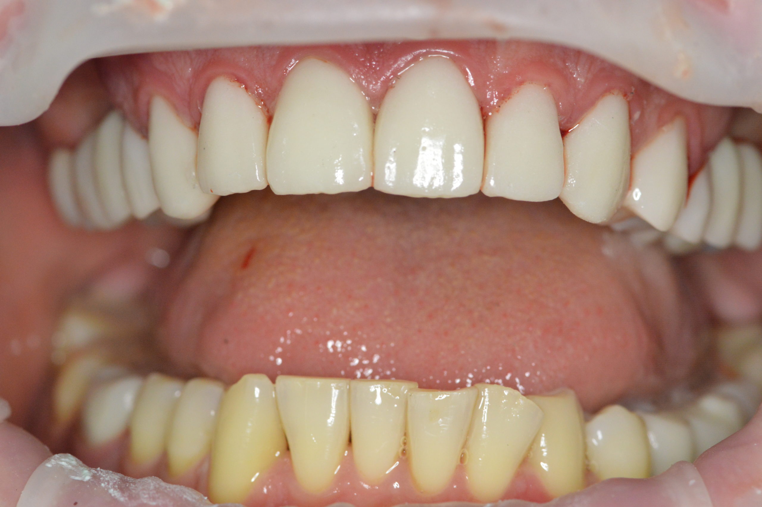 The surgery began with the extraction of tooth number 26 and bone graft on the upper jaw. It continued with implantation on 27, 26, 16 and 15 on upper jaw and 35 and 37 on lower jaw.