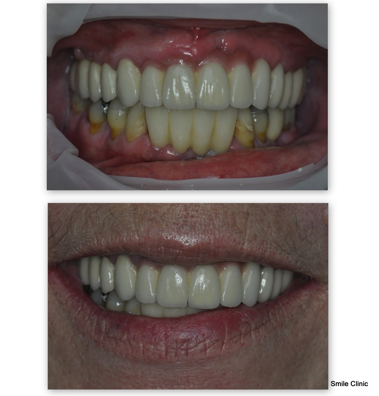 6 dental implants, abutments, some tooth extractions and 14 crowns for the upper jaw, and 3 dental implants for the bottom jaw and 6 crowns.
