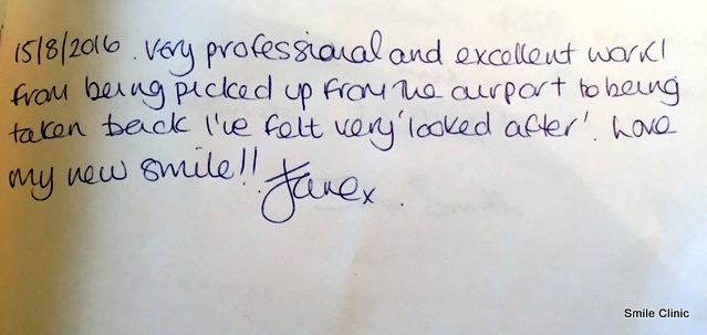 Very professional and excellent work! From being picked up from the airport to being taken back I’ve felt very looked after. Love my new smile!!! Jane”