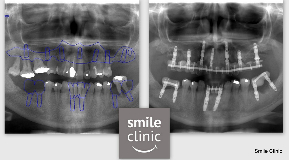 Jane came out to us first from Manchester for a free consultation & X-rays with Dr. Marek before returning at a later date to complete her dental treatment which, as you can see from the X-rays, included 13 dental implants & crowns.