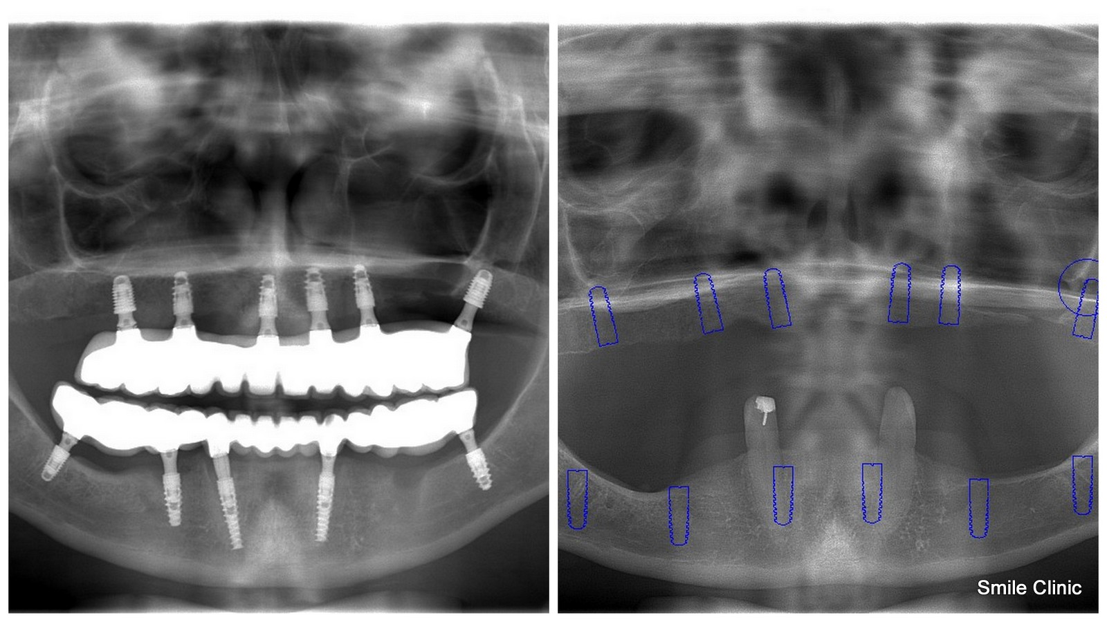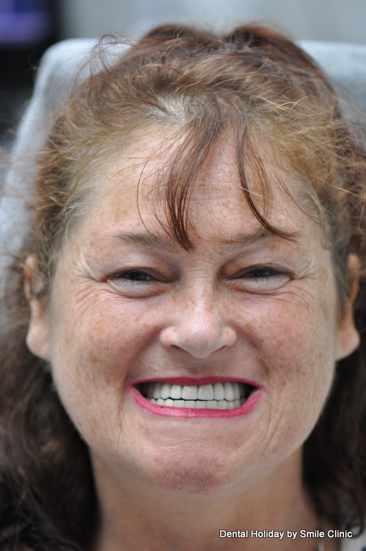 Dental Holiday in Slovakia offers a same day replacement of the whole upper and lower jaw with a semi-permanent bridge based on dental implants (11 were used in this case to add extra strength support in the thin amount of jawbone available for stable bridge support).