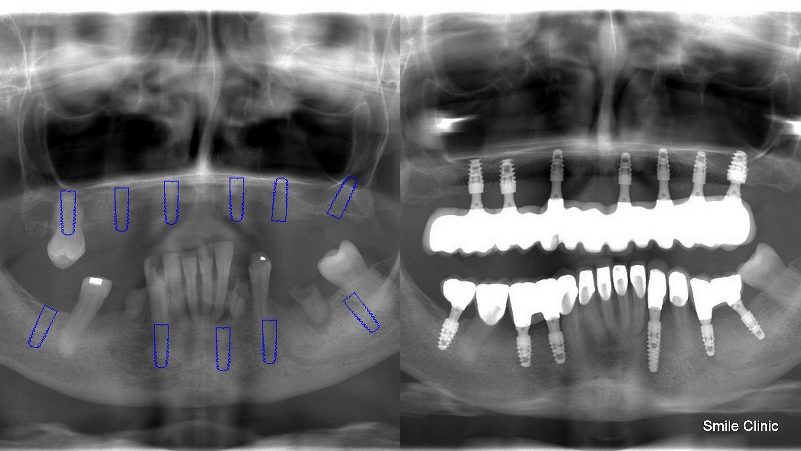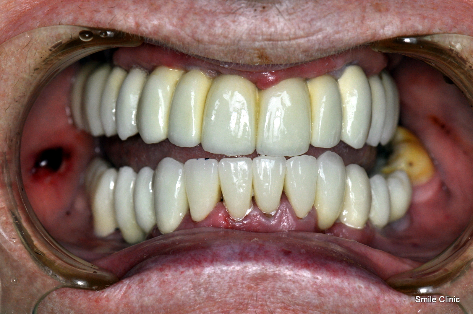 After over 100 email exchanges and a calming pill taken before treatment, in late November we finally got to begin our magic on Lynne’s smile. This involved placing 13 dental implants (7 to the upper jaw and 6 to the lower jaw) and then immediately replacing the denture and extracted teeth with a full semi-permanent bridge while the implants took 3-4 months to heal. (this specialty is only available in our clinic and included free with the overall treatment cost).