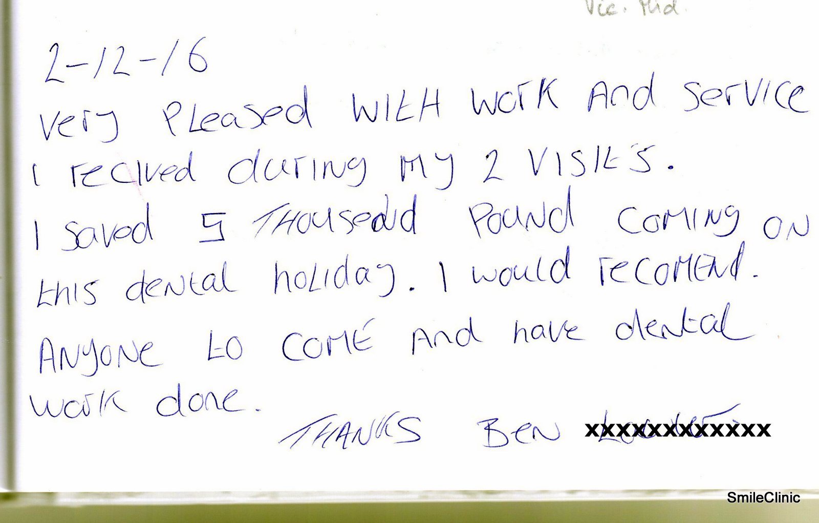 Very pleased with work and service I received during my 2 visits. I saved £5000 coming on this Dental Holiday. I would recommend anyone to come and have dental work done.”