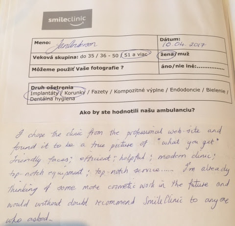 Coming to us through Vienna by train, she was picked up each time by our driver at the station. Jan completed her treatment in April 2017 and said this about her Dental Holiday with Smile Clinic in Slovakia: