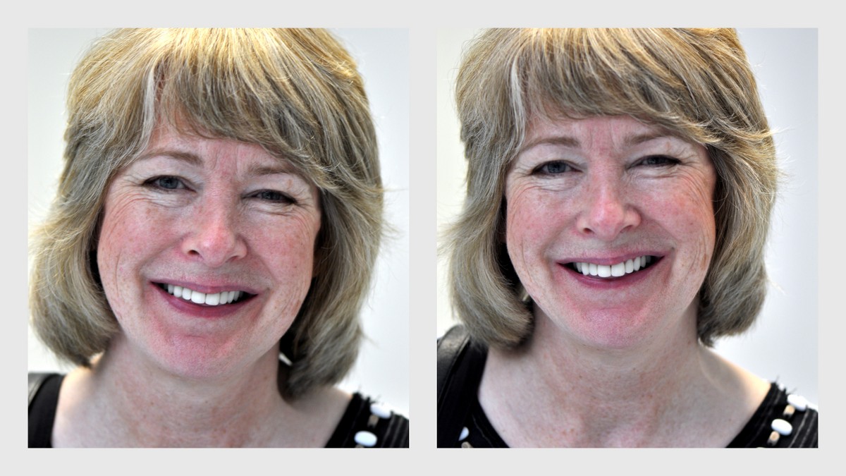 Angela from Bournemouth had some old crowns on her four front teeth that were approximately 38 years old and her gums had receded to the point where the bone was exposed so she was left with no confidence to smile.